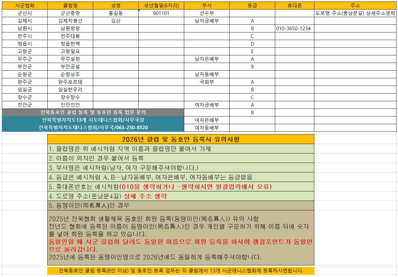 첨부파일 2 : 동호인 등록 입력파일(엑셀)