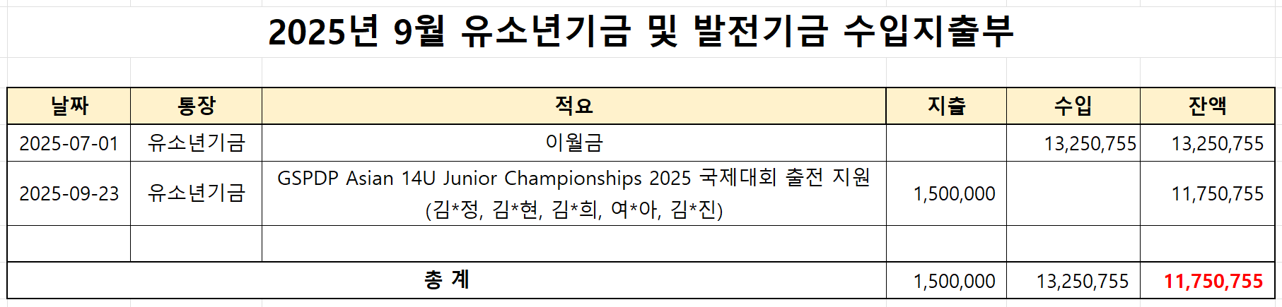 25년 9월 29일까지 유소년기금 현황 자료를 업로드합니다.